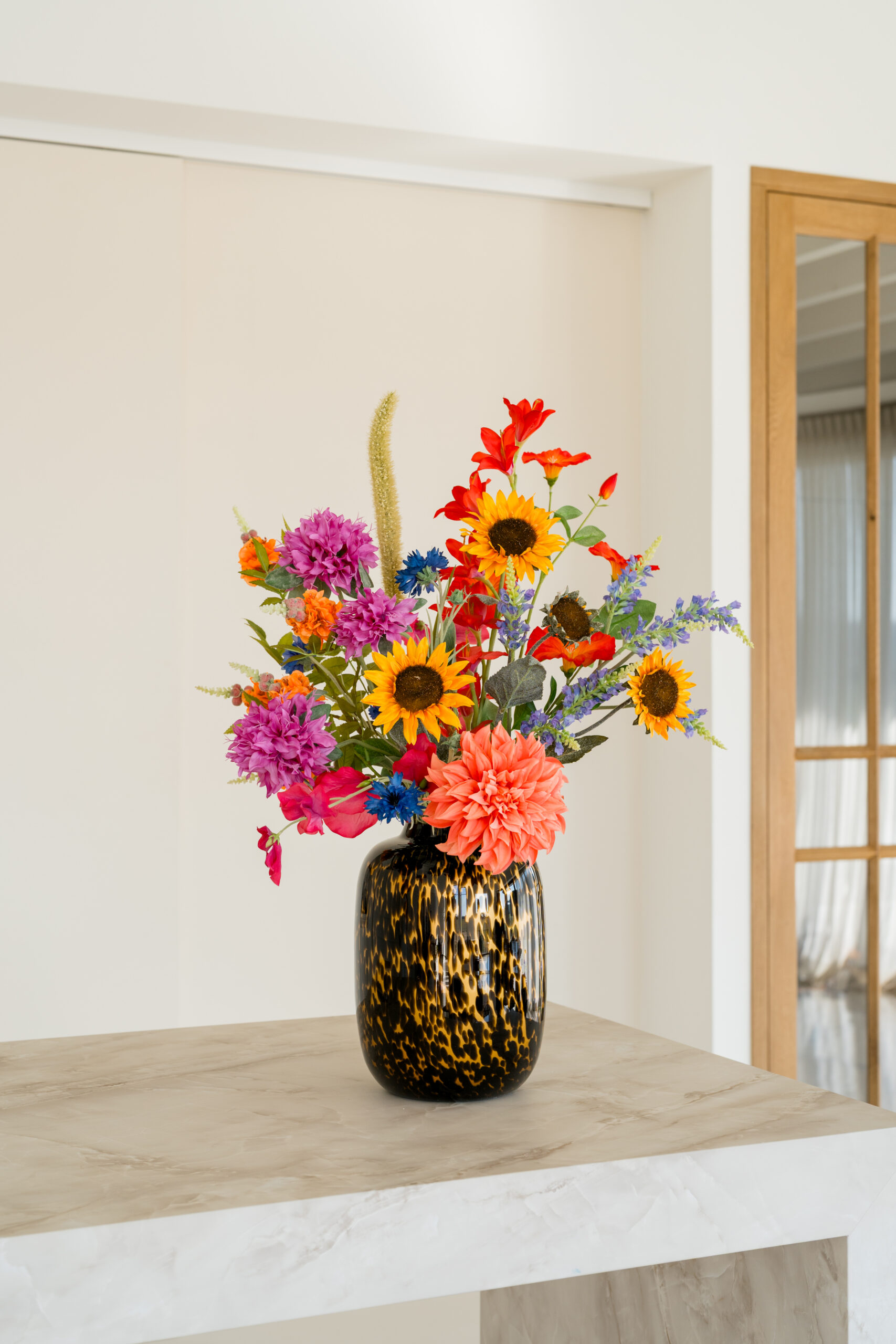 Het is niet gebruikelijk vazen/boeketten retour te sturen ivm de kwetsbaarheid van het product. Bij twijfel om te bestellen adviseer ik een afspraak te maken om bij ons in de winkel langs te komen.