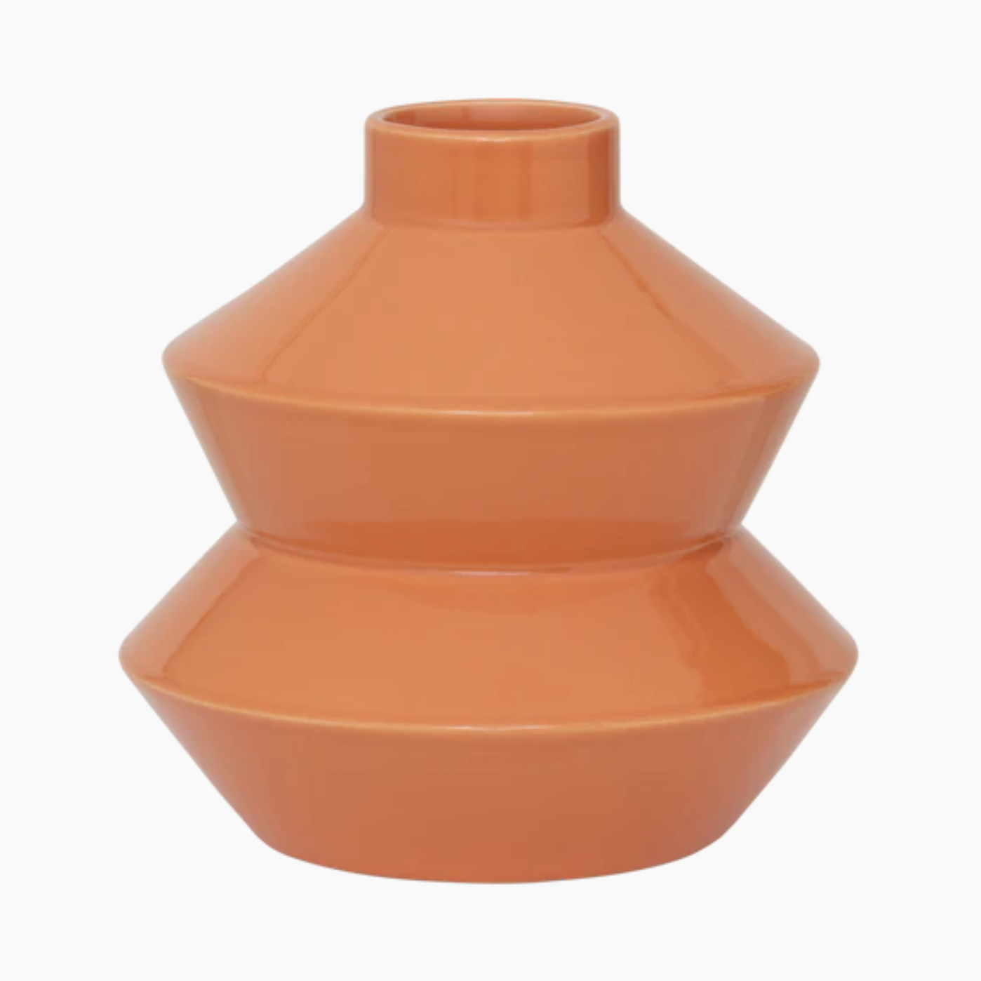 Een vaas van keramiek in de kleur nectarine met een glanzende afwerking, handgemaakt in Portugal. De geometrische vormen en vrolijke kleur zorgen voor een opvallend design dat levendigheid en een moderne uitstraling aan je interieur toevoegt.