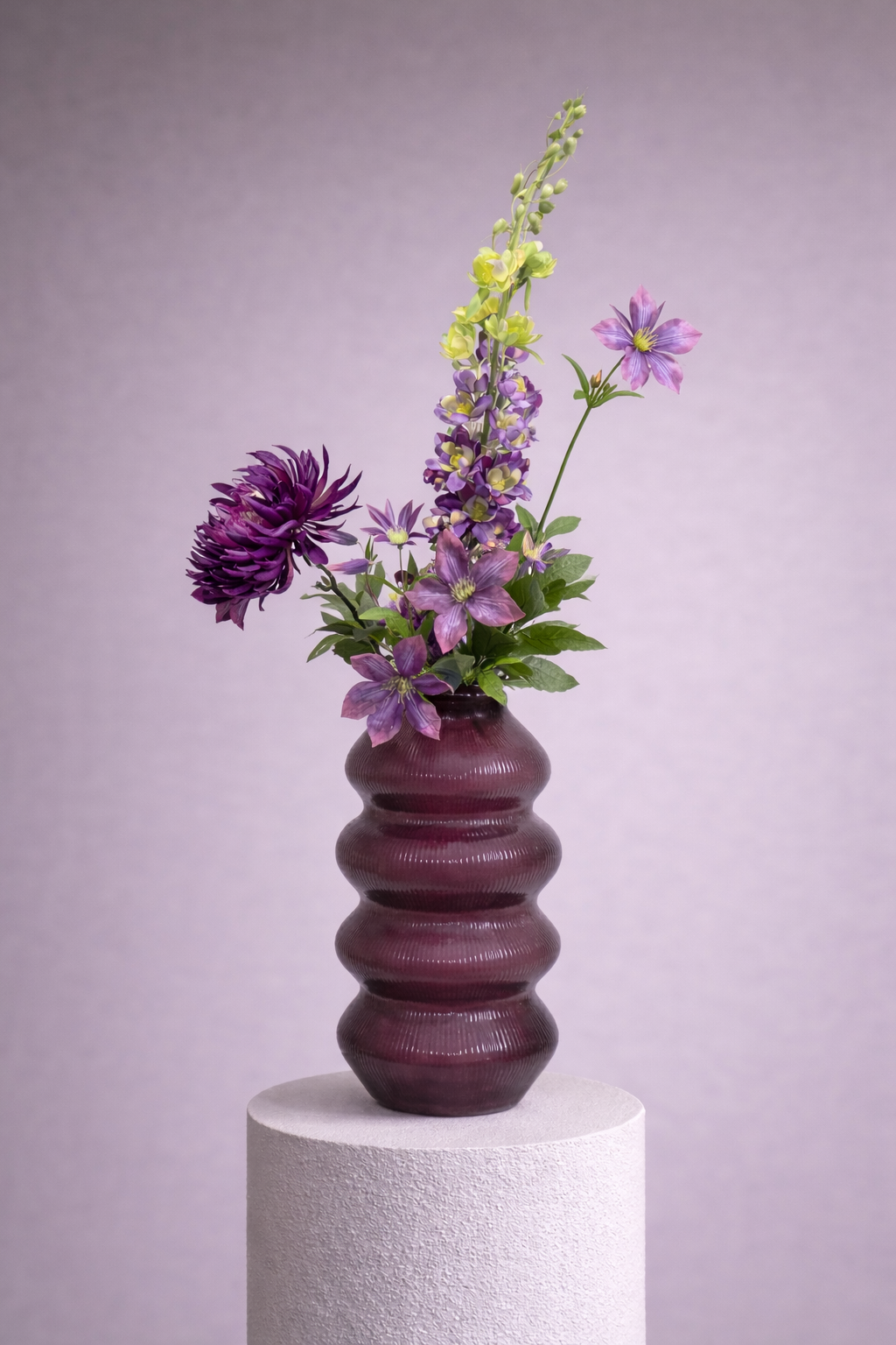 Zijden boeket Celine is een krachtig en elegant statement boeket met diepe, rijke tinten. Het boeket is samengesteld uit luxe paarse bloemen, waaronder een volle chrysant, sierlijke clematis en een opvallende verticale delphinium die zorgt voor hoogte en een moderne, luchtige uitstraling.